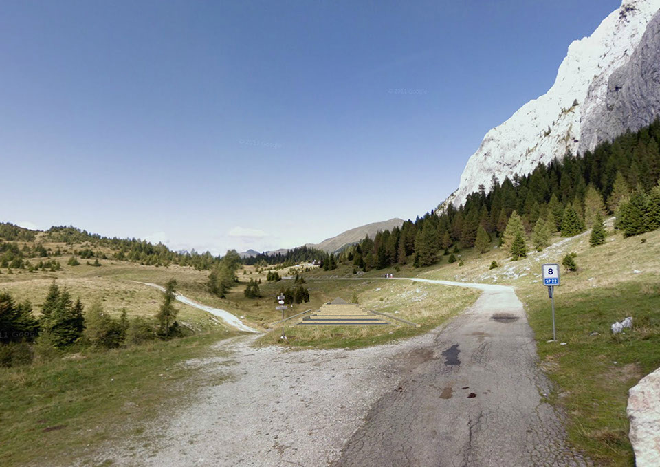 Il settore di posizionamento degli elementi architettonici è comandato da due fattori: la strada esistente che sale, che viene mantenuta ma riformata, e le direttrici di allineamento visivo del Piave come se lo potessimo vedere, nella sua vera direzione, stando sulla sorgente.